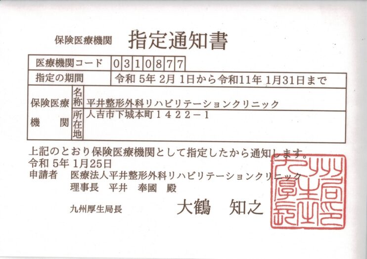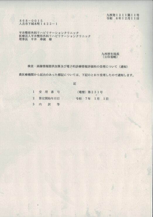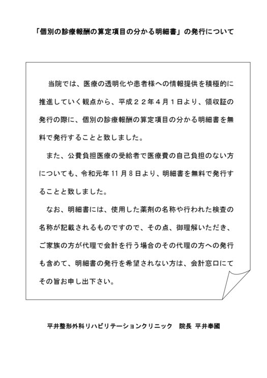 2024年度の診療報酬改定を機に、医療法や健康保険法等により、病院内に掲示している書面等を病院ホームページへ掲載することが義務付けられました。平井整形外科では、院内に掲示されている実際の掲示物をそのまま公開いたします。画像を新しいタブで開いて頂くと大きな画像でお読みいただけます。なお、掲示物は事前の予告なく更新いたします。あらかじめご了承願います。〒868-0015